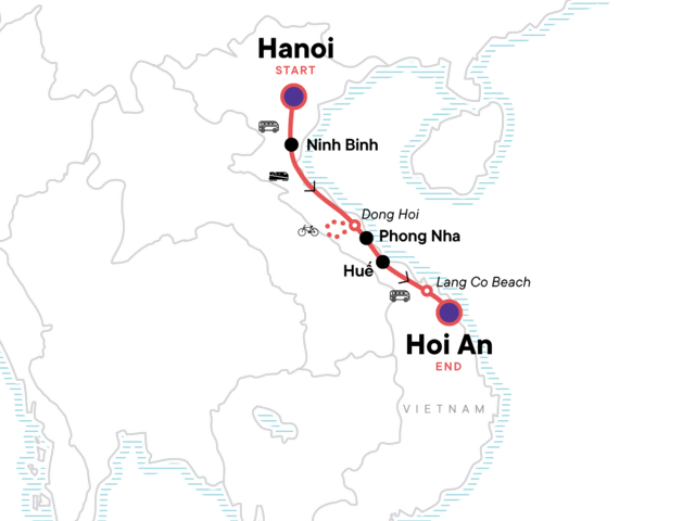 Your Welcome Moment: Welcome Moment - Meet Your CEO and Group. Hanoi Foodie Culture Tour. Tam Chuc Pagoda Tour. Dong Hoi Wet/Fish Market tour and countryside cycling. Vinh Moc Tunnels Tour. An Bang Cemetary Tour. Visit Lang Co Beach. Hai Van Pass and Marble Mountain Tour. Hoi An Old Town Walk and Riverside Evening Out. All transport between destinations and to/from included activities.